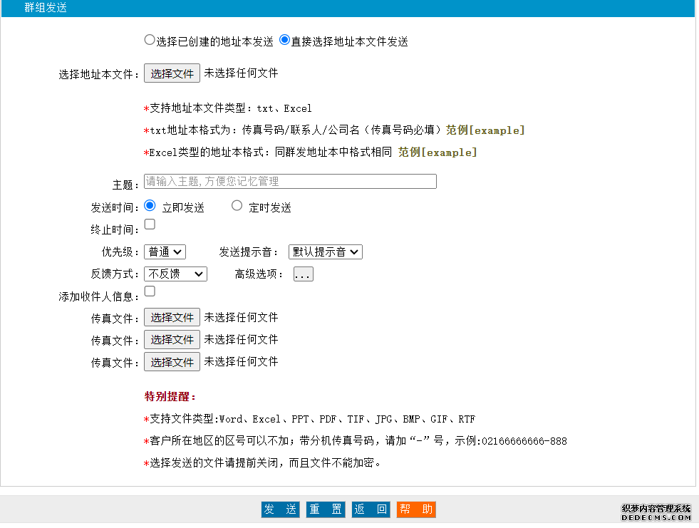 可以,你可以不創建地址本而直接導入號碼文件群發傳真。