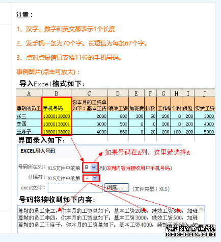 2、員工工資條短信群發,即每個員工的基本工資、績效等都不一樣的變量短信群發操作如下圖所示。有三種個性化變量短信提交方法,可根據您自身資料格式選擇其中一種。