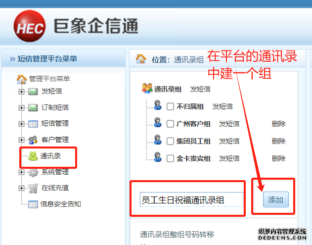 第三步、在平臺界面的通訊錄中建立一個新的通訊組(有手機號碼、姓名、生日日期),操作方法如下所示