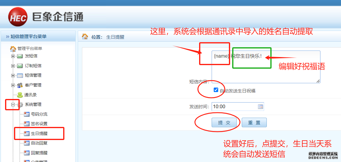 第五步、在平臺界面的系統(tǒng)管理中點擊“生日提醒”欄目,在這里編輯生日祝福語后員工生日當天系統(tǒng)就會自動按設(shè)定的時間發(fā)送祝福短信,設(shè)置方法如下圖