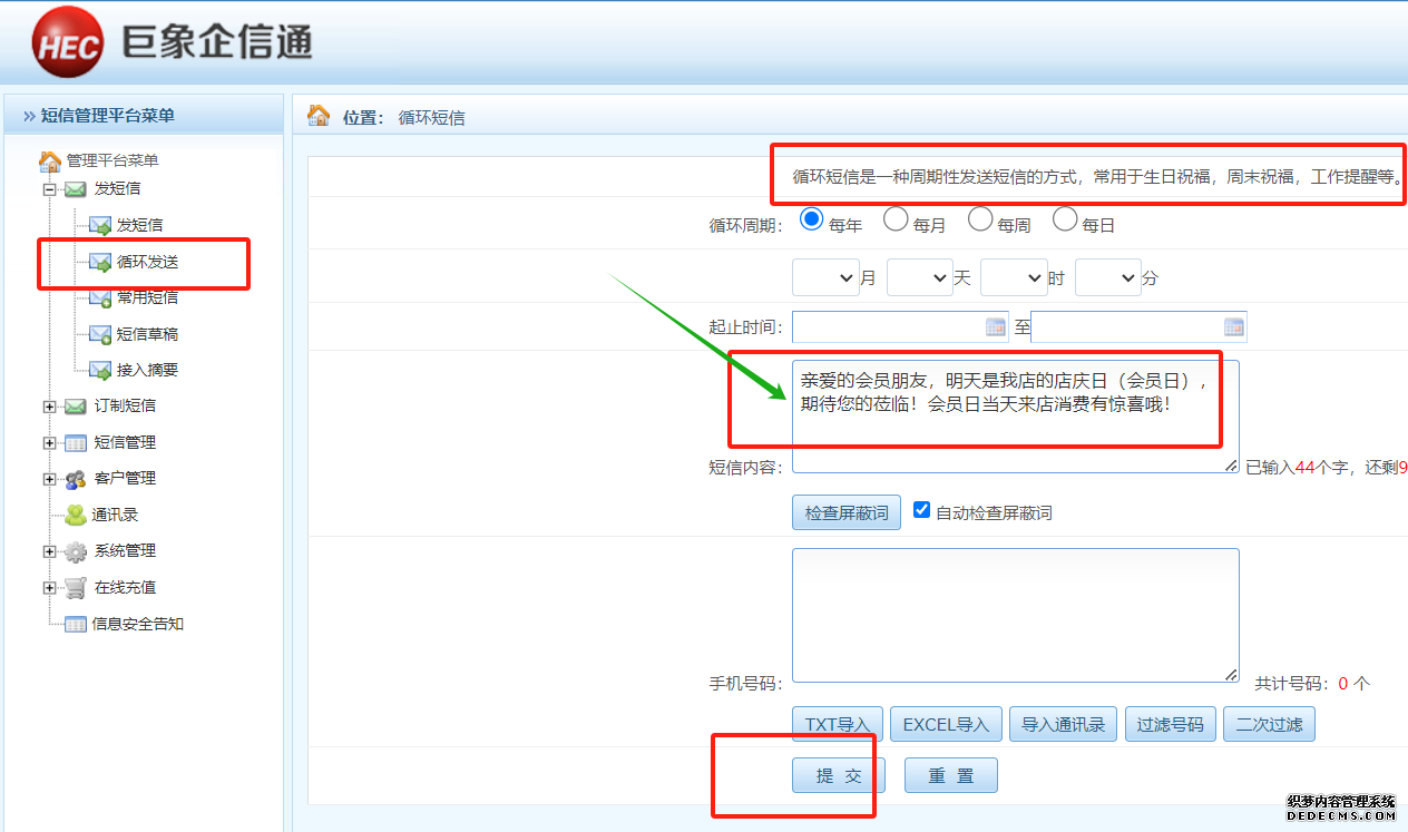 第二步、聯(lián)系客服開通自動定時循環(huán)發(fā)送短信的功能